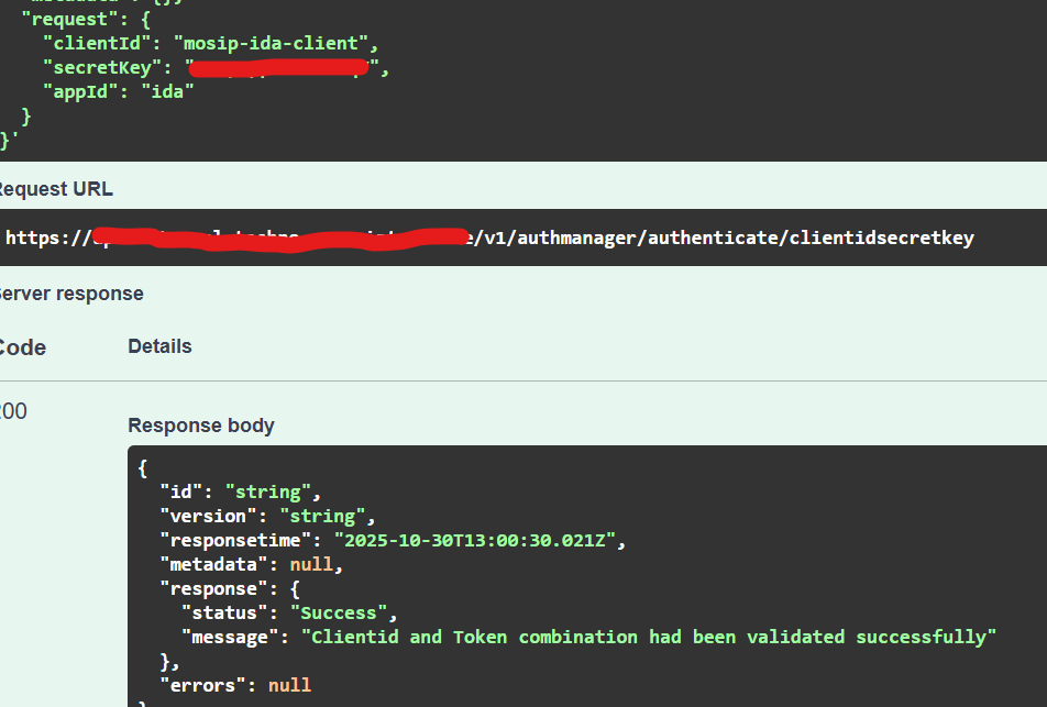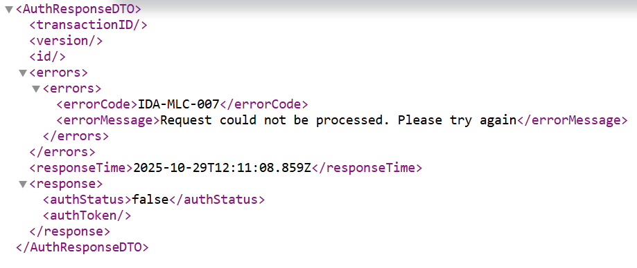 I am still getting the IDA-MLC-007 error with authStatus as False; thus, the request could not be processed. I have attached a screenshot of the authentication UI too to see that the IDA client is validated successfully; hopefully that is the client that is required to perform the action.